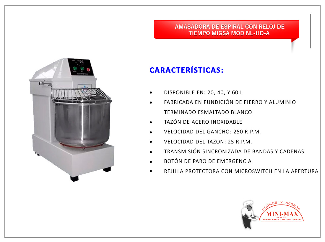 Amasadora De Espiral 20, 40 Y 60 L Con Reloj De Tiempo Migsa Mod Nl-Hd-A
