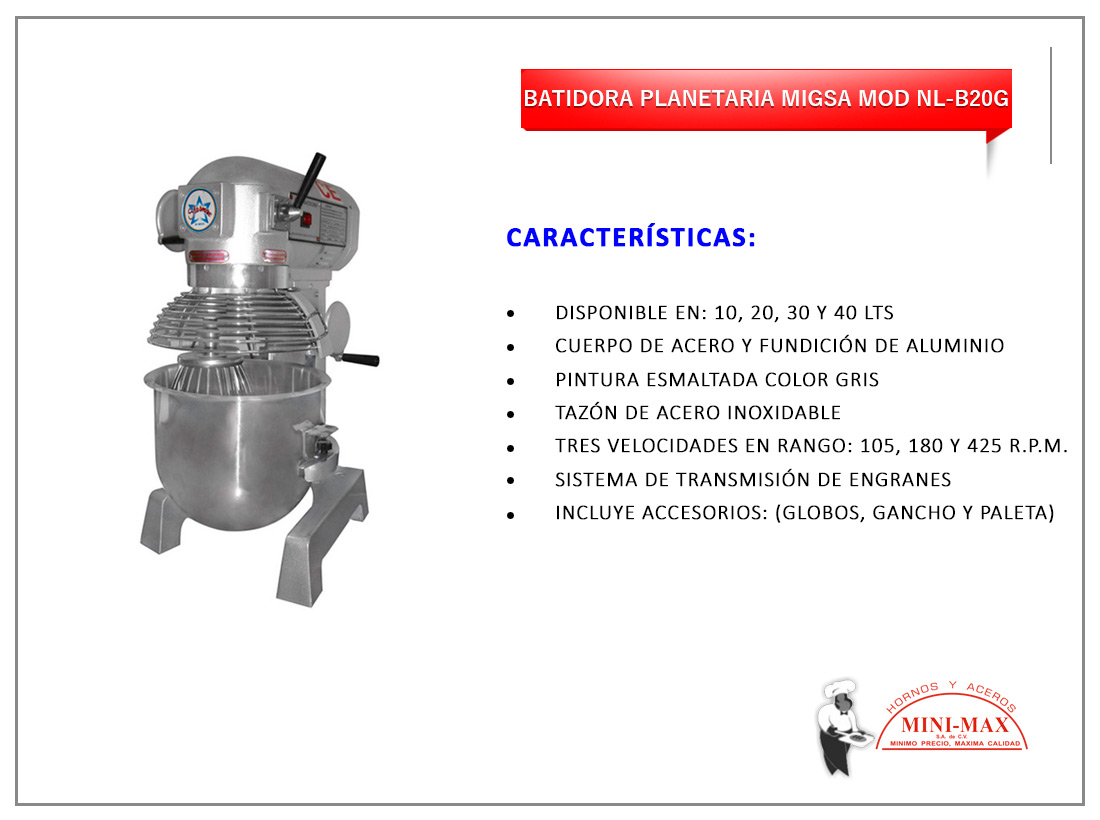 Batidora Planetaria Con Tazón De 10,20,30 Y 40 L Migsa Mod Nl-B20g